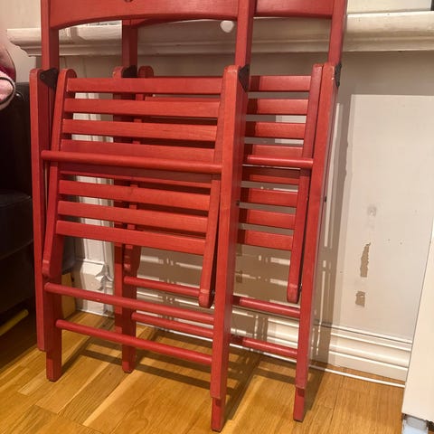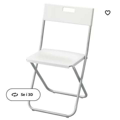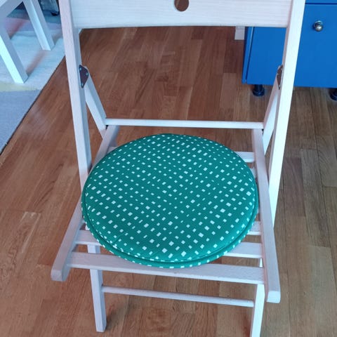 Selger 2 stk IKEA Frösvi klappstoler, hvite, fordi vi ikke trenger dem lenger. Du får med pute til også. Noen bruksmerker her og der, men de fungerer like fint som før :-) Disse kan også henges opp på veggen for å spare plass.