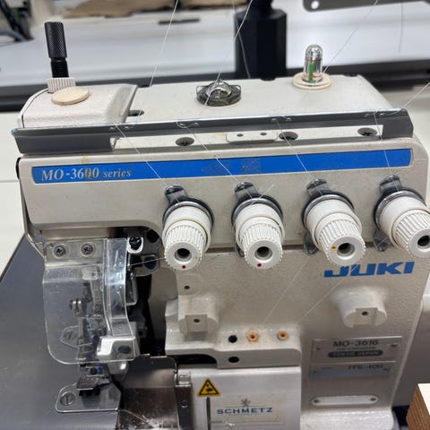 Juki MO-644D overlock symaskin med flere innstillinger for trådspenning og stingbredde. Maskinen leveres med strømledning, fotpedal, og tilbehør for overlock-søm. Egnet for tekstilarbeid som krever overlock-søm for å sikre og avslutte kanter.