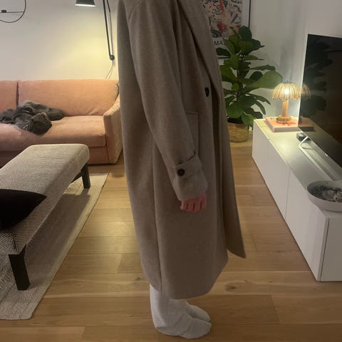 Gina Tricot,størrelse M, farge mørk blå. Jakken har belte og lang passform.