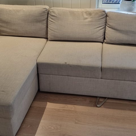 Sofaen har stått på ett gjesterom og er blitt lite brukt både som seng og som sofa. Ingen flekker eller skader.