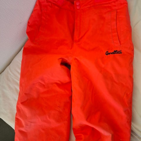 God "snøbukse" med seler, disse er ikke avtagbare.. Brukt en sesong, men uheldig og hang fast, så ett lite hull på høyre fot, litt slitasje på knær. Snøstopper på innsiden.