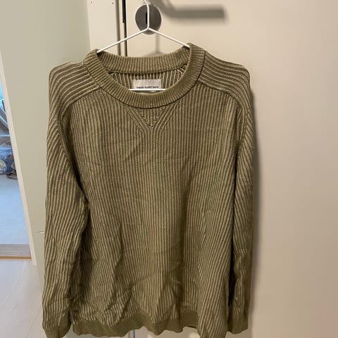 COS langermet herregenser i bomull, størrelse L, i brun farge. Genseren har en stripete design med lyseblå og hvite detaljer. Laget av bomullsmateriale, egnet for hverdagsbruk.