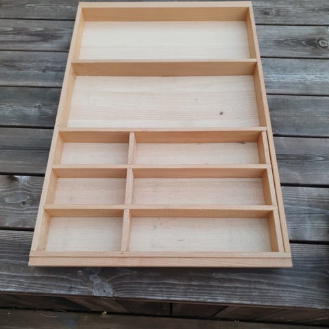Tradisjonelt håndverk med tre hyller og spor til bestikk. Passer fint til kakegafler, dessertbestikk eller som dekorativ oppbevaring på kjøkken eller hytte.