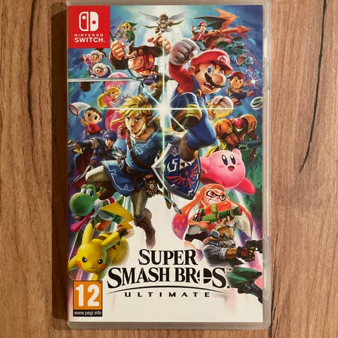 Super Smash Bros. Ultimate Nintendo Switch-spill. Spillkassett og etui med bilder av spillkarakterer. Passer for Nintendo Switch-konsoll.