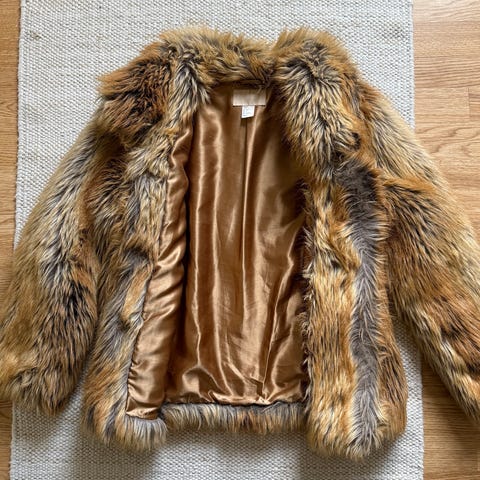 Lite brukt fuskepelsjakke med lommer. Lukkes med hemper (se bilde).