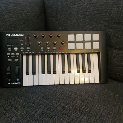M-Audio Oxygen Pro 25 MIDI Keyboard med 25 tangenter, flere kontrollknapper og pads for musikkproduksjon og live-opptredener.