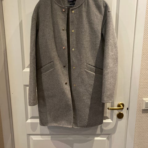 Gul Tommy Hilfiger ullkåpe i ullblanding (67% ull, 27% nylon, 2% polyester) med polyesterfôring. Størrelse M. Jakken har knappelukking og stripete fôr. Fôret har gått opp i sømmen i overgangen erme og kropp på begge ermene (se bilde).
