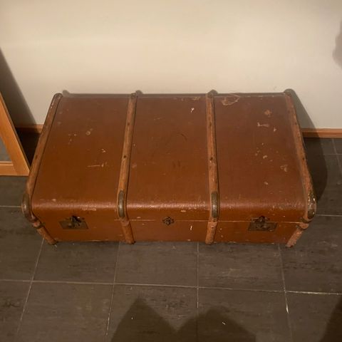 Rød vintage kiste med metallbeslag. Kisten har en firkantet form og er laget av tre med metallforsterkninger på hjørnene og langs sidene. Den har en hengslet lokk og en metallhåndtak på fronten. Kisten viser tegn på slitasje og sprekker i treverket, noe som indikerer alder og bruk.