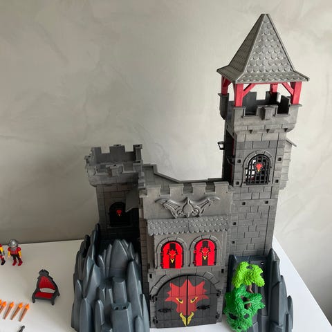 Playmobil Ridderborg leketøyssett med flere ridderfigurer, dyr, våpen og tilbehør. Settet inkluderer en borg med tårn og porter, samt ulike tilbehør som stiger og våpen. Passer til lek og samling for barn.