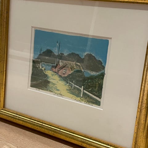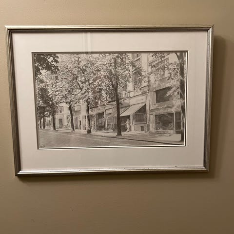 Innrammet kunsttrykk med svart-hvitt motiv med navnet «Utsikt fra slottet». Motivet vider utsikten fra Slottsplassen og nedover Karl Johan. Ser ut som en tegning. Signert «O Truls 89». Denne har jeg selv kjøpt på Finn for ca 8 år siden.