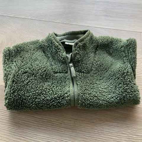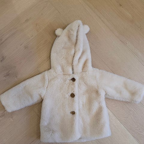 Søt, myk teddyjakke fra H&M, str 80. Lys beige farge. Nyvasket. Glidelåslukking, og to åpne lommer foran.