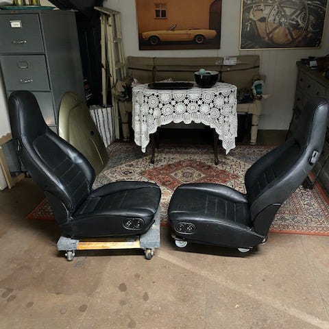 911 997 Porsche sete skinn seter i beige farge. Setene har elektrisk justering og varme. Hele og pene med inntakte funskjoner. Selges samlet for kr 9500,-