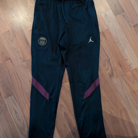 Nike PSG joggebukse i størrelse S for menn, laget av bomull. Joggebuksene er blå og har detaljer som PSG-logo og stripemønster på sidene.