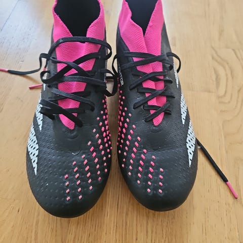 Adidas Predator fotballsko str. 40 2/3. Knottene er FG men ble brukt til kunstgress som funket fint. Denne skoen er brukt innimellom i sesongen for variasjon for beina. De er cirka brukt 30 ganger og ingen kamper. De er fortsatt i god stand og knottene er ikke slitt. Framfor er de blitt slitt (se bilde) men har ingen tegn til å løsne. Sålen er slitt men det er bare det øverste laget men under er det godt som nytt. ( Får med baggen til skoene)