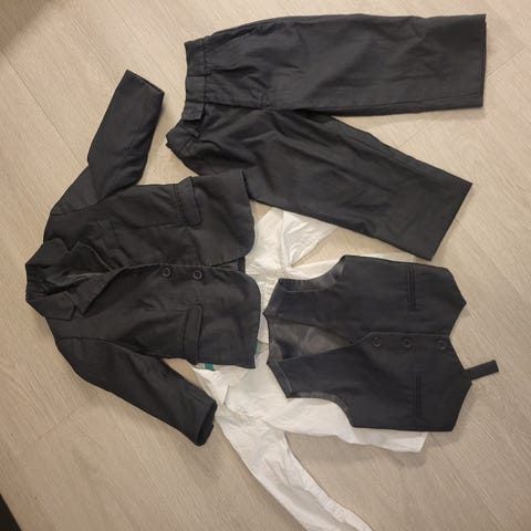 Pent brukt dress. Skjorta er i str 98 og dressen i str 104. Brukt samtidig, da skjorta er ganske romslig. Marineblå