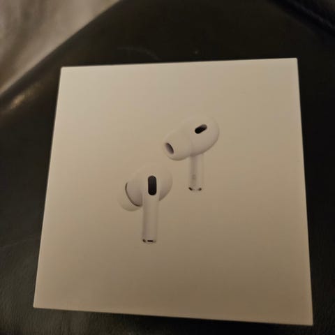 Apple AirPods Pro 2. generasjon headset med ladeetui og MagSafe. Trådløse ørepropper med aktiv støydemping og tilpasset passform. Leveres med ekstra øreputer og original emballasje. Kjøpt på Elkjøp.