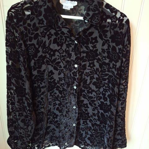 Veldig flatterende «sjal» i v-utringing, og med integrert topp/innerfôr i frontstykket på blusen. Lekkert croppede ermer og feminint formsydd fasong.