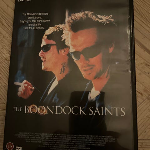 The Boondock Saints DVD med filmcover som viser hovedkarakterene og temaer fra filmen.