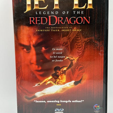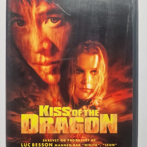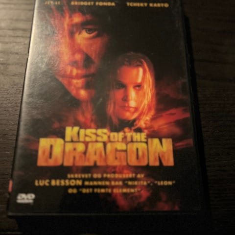 Kiss of the Dragon med Jet Li, Bridget Fonda og Tchéky Karyo. Plakaten har et mørkt fargetema med bilder av hovedkarakterene.
