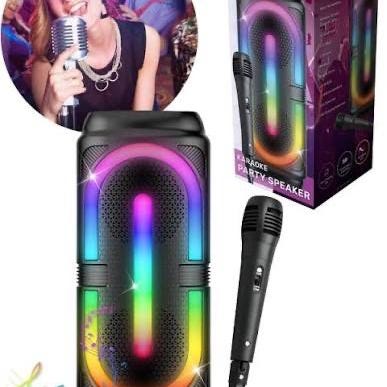 Koble til telefonen din eller andre musikkspillere til denne maskinen for å sette i gang festen, eller synge høyt til dine favorittsanger. Høyttaleren er i rosa og har diskokule på toppen med LED-lys for å øke party-stemningen. Alle musikkavspillere kan brukes så lenge det har Bluetooth, SD-kort, AUX eller USB. Høyttaleren har en liten og nett størrelse som gjør den ypperlig å frakte med seg, og den kommer med et oppladbart batteri og en mikrofon med ledning på nesten 3 meter.
