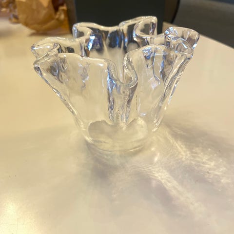 Magnor Glassverk glassvase i blått glass med dekorativ organisk form.