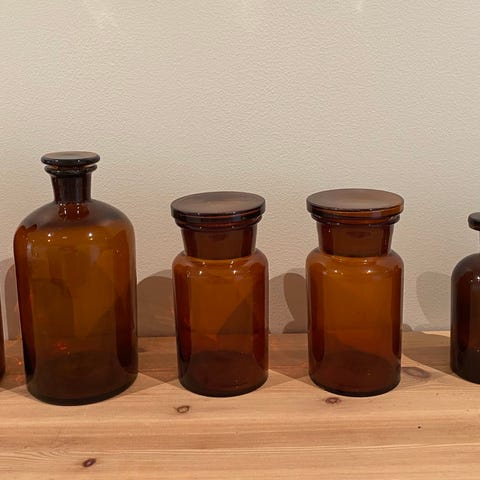Vintage apotekflasker / laboratorieflasker i ravglass med glasspropper