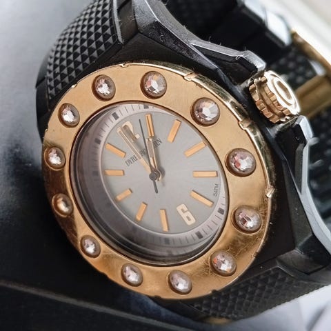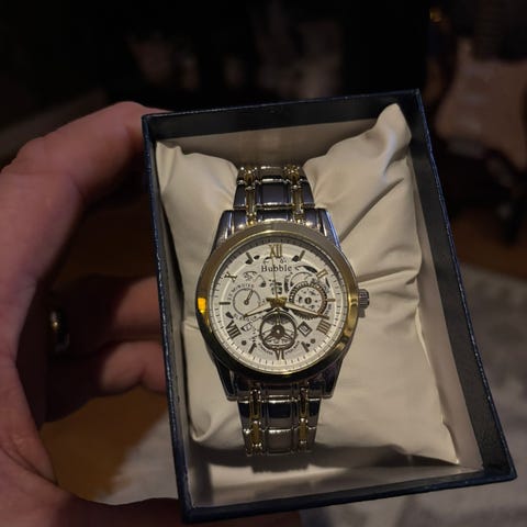 Klokken går, med nytt batteri. Selges billig fordi den trenger feste på enden av reimen.