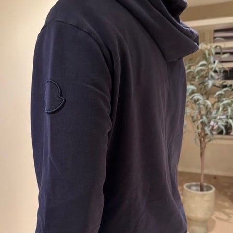 Moncler hettegenser i størrelse M for menn. Den har hette med snor og Moncler-logo på bryst og erme.