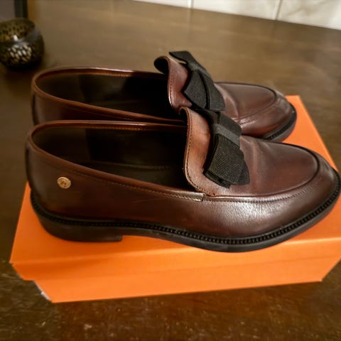 Loafers i skinn. Chunky hæl. Ingen merker eller skader. Har brukt hælbeskyttelse ( det viser merke etter disse ). Ingen betydning for bruk.