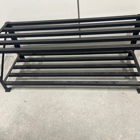 Pent brukt skohylle med hvite trekanter og metall stenger