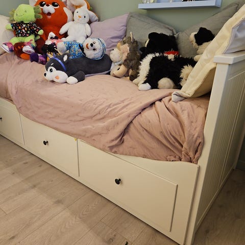 Hemnes dagseng fra IKEA. 2 madrasser + 1 overmadrass kan medfølge gratis. Madrassene er Sultan Harestua og overmadrassen er Sultan Tårsta