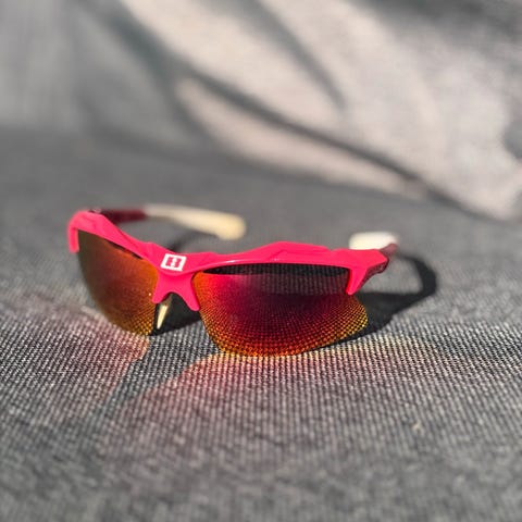 Oakley solbriller for unisex. Brillene har en sporty design med en neon gul ramme og speilglass med rød-oransje refleksjon. Egnet for utendørs aktiviteter som krever beskyttelse mot sollys.