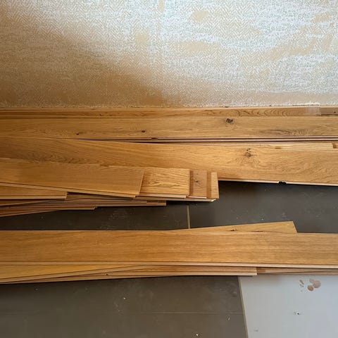 Byggematerialer bestående av ca. 3kvm parkett, fleksi lister, taklister, gulv/karm lister.