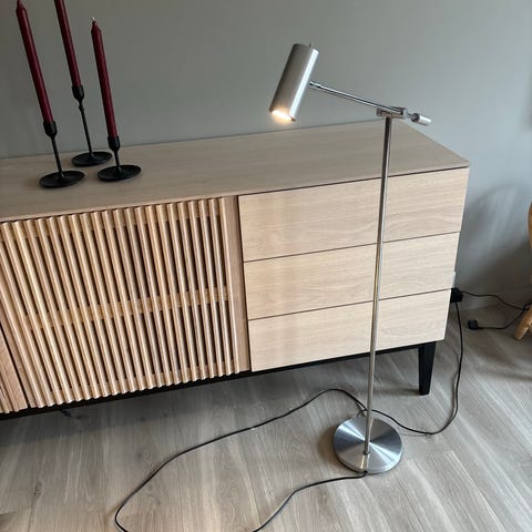 Belid Diablo gulvlampe med svart og rød finish. Lampen har en karakteristisk design med flere skjermer for jevn lysfordeling. Passer til oppholdsrom og gir indirekte belysning. Høyde 150 cm.