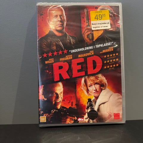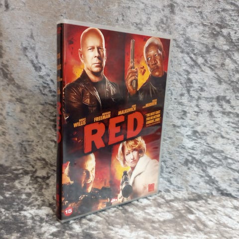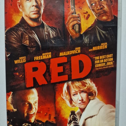 filmen Red med skuespillere Bruce Willis, Morgan Freeman, John Malkovich og Helen Mirren. Coveret viser karakterene og filmens tittel i rødt mot en mørk bakgrunn. Passer til veggdekorasjon for filmfans.