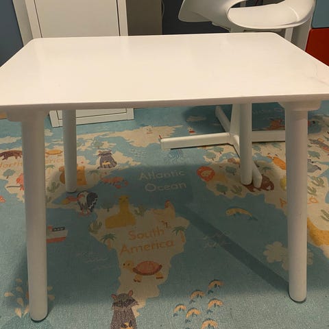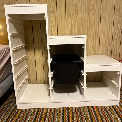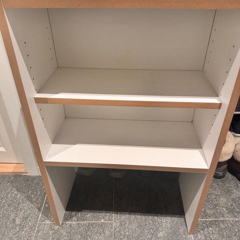 Barnebokhylle med oppbevaring. Fjernet «listen» på den nederste hyllen for at barnet lettere skulle få tak i noen bøker selv. Masse bruk igjen.