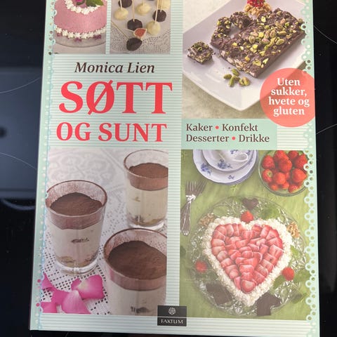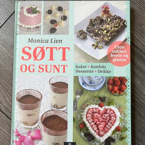 Boka "Søtt og sunt" av Monica Lien. Kokebok med oppskrifter på kaker, konfekt, desserter og drikke. Boken fokuserer på sunne alternativer uten hvitt sukker og gluten.