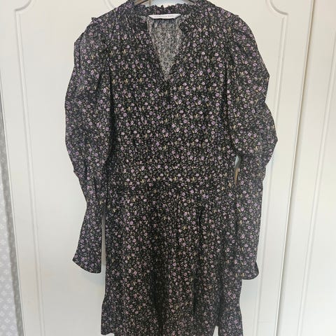 byTiMo Hverdagskjole i størrelse S, laget av polyester. Kjolen er svart med blomsterprint og har lange ermer. Passer som hverdagsplagg for kvinner. Har lommer. Stor i størrelsen.
