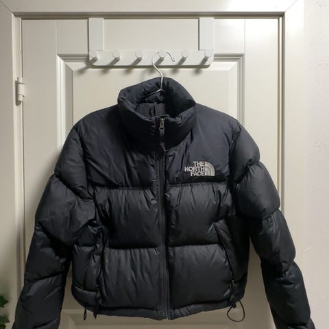 The North Face Nuptse 700 cropped dunjakke i størrelse S for kvinner. Jakken har blå farge med svarte detaljer. Den lite brukt, men har en flekk på venstre arm. Se bilde.