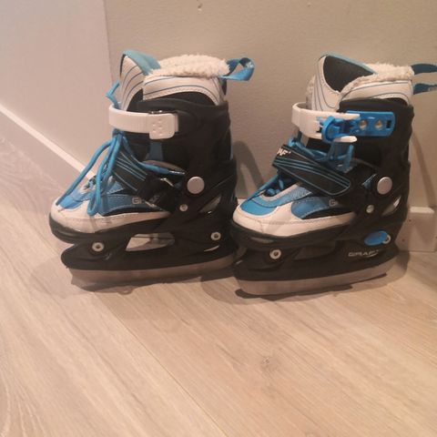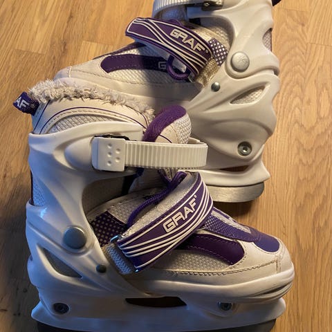 Selger Graf regulerbare barneskøyter str 27-30. Skøytene kan enkelt reguleres mellom de angitte størrelsene.