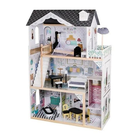 Lundby dukkehus med tre etasjer, rosa tak og detaljerte interiørmøbler. Laget for barn og egnet som lek og innredningsaktivitet. (Finn AI)
