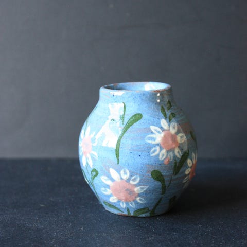Dekorativ håndmalt keramikkvase med blomsterdekor i rosa og blå toner. Klassisk form