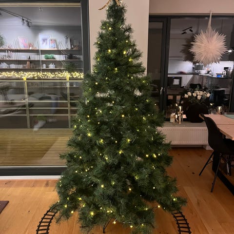 Selger et pent brukt kunstjuletre med komplett julepynt. Alt selges samlet.