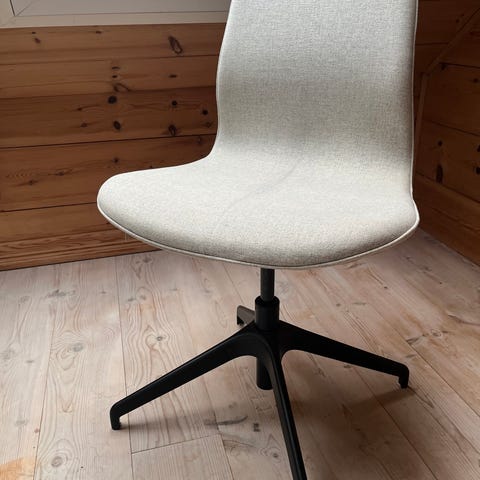 Långfjäll kontorstol fra Ikea i beige med svarte bein, uten hjul. Pent brukt og i god stand. Kan heves, senkes og snurres rundt. Har vippelås slik at stolryggen kan låses i oppreist stilling.