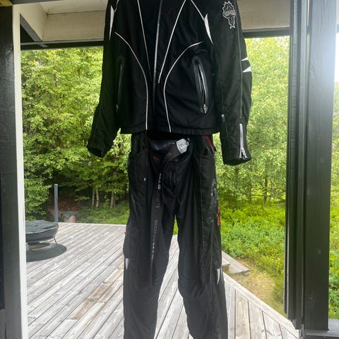 Jeg fikk dette i gave da jeg skulle begynne med MC kjøretimer men fikk aldri sjansen til å bruke det da jeg ble gravid på samme tid. Selges da det ikke fins tid til å ta opp dette igjen. Klæra er som nye, også skoene men skinnet er preget av å stå i kjelleren i noen år. Tilsvarer strl s, og skoene 38/39.
