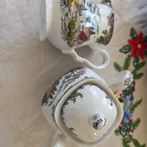 Selger originale deler fra den kjente engelske produsenten Alfred Meakin Ltd, merket “Perfection Shape – England”. Klassisk bølget design med dekorativ hjerteformet hank på lokket. Ekte engelsk fajanse fra første halvdel av 1900-tallet – perfekt både til bruk, dekor og for samlere.