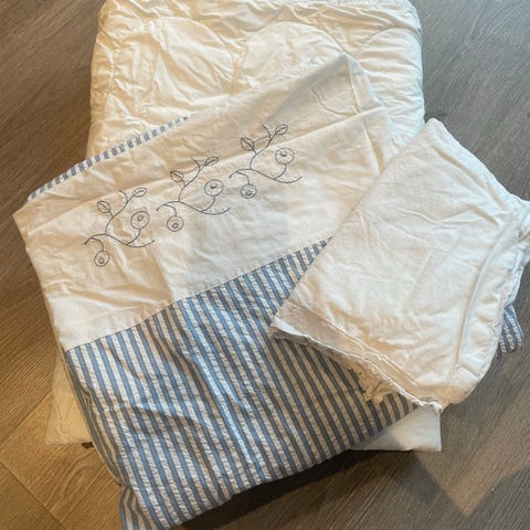 Dynen og trekket er kun brukt en håndfull ganger og selges da jeg innser at jeg har kjøpt en for stor og dyne for vårt barn.