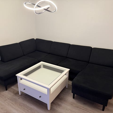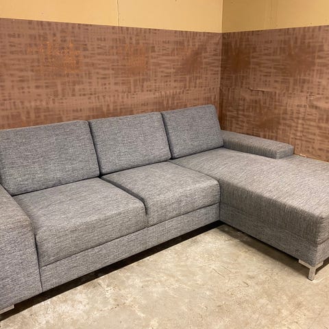 Malte hjørnesofa med sjeselong og endeavslutning. Kjøpt ny oktober 2022. Renset jevnlig med tekstilrenser. Avtakbare putetrekk, og vendbare ryggputer som gir sofaen lengre levetid.