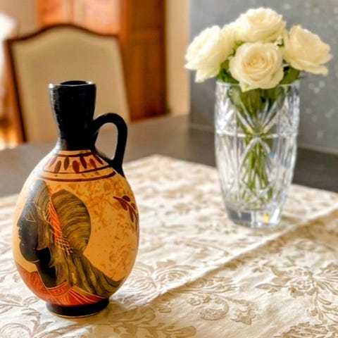 Selger Vintage keramisk vase med blått og hvitt mønster, høyde 20 cm. Vasen har to håndtak og en smal åpning, egnet for dekorative blomsteroppsatser. Pris 120 kr. Kan sendes med Post Nord