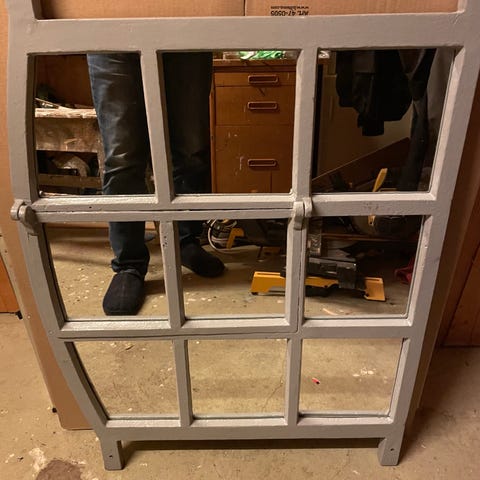 Gammelt vindu med speil. Tror det er over 100 år gammelt. Satt sammen med treplugger ( se bilde) .